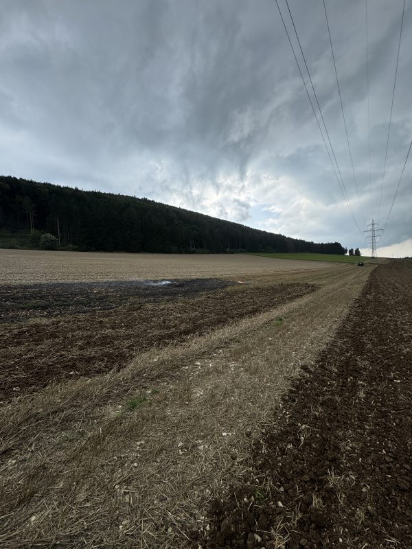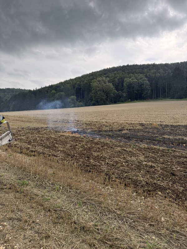 Die Feuerwehr wurde zu einem Flächenbrand alarmiert. Beim Eintreffen standen rund 10 m² Stoppelfeld in Brand. Das Feuer wurde mit einem C-Rohr abgelöscht, anschließend bearbeitete der Landwirt die Fläche nochmals mit landwirtschaftlichem Gerät, um ein erneutes Aufflammen zu verhindern.