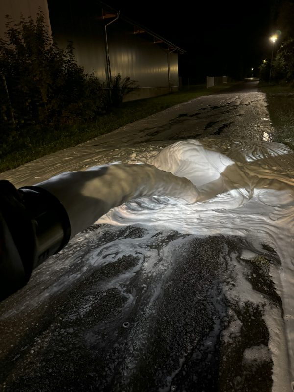 Für die Ausbildung wurde ausschließlich umweltfreundlicher Übungsschaum verwendet, der biologisch abbaubar ist und die Schaumarten Schwer- und Mittelschaum abbildet. So konnten unterschiedliche Brandszenarien wie PKW- und Kellerbrände realitätsnah geübt werden.